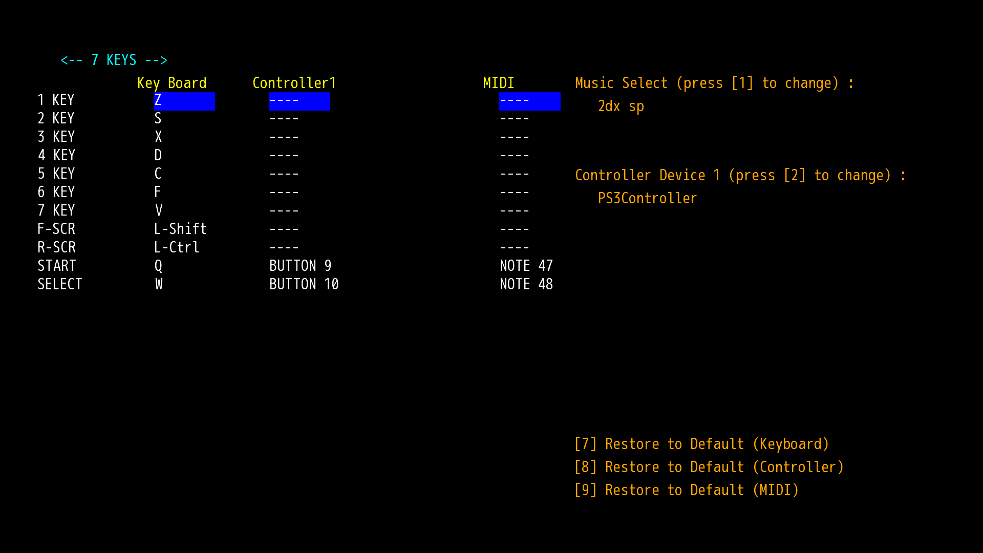 - 初期設定では、各レーン毎に以下のようにKEYが割り当てられています。